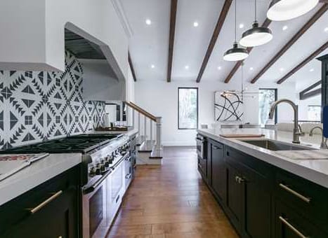 Not a typical 2-story home, the split levels offer easy movement through the living space. A stunning kitchen is outfitted with Thermador appliances, custom cabinetry with color-option remote interior lighting, and a large, eat-at island.